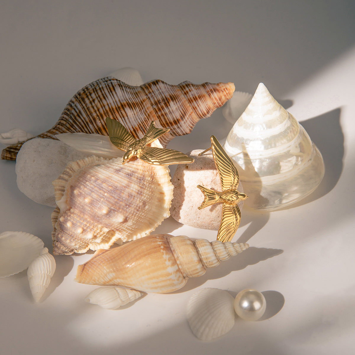 Take flight in style with the Skyward Soar Bird Earrings—a graceful statement piece inspired by freedom and motion. Crafted from polished gold-tone stainless steel, these lightweight earrings (7.56g) feature intricately sculpted birds in mid-flight, measuring 4.76 cm wide by 2.3 cm high. Hypoallergenic and waterproof, they combine artistry and durability, making them perfect for nature lovers, dreamers, and bold fashion moments alike.
