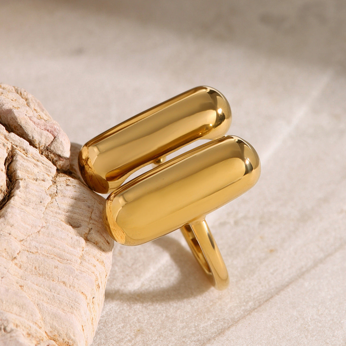 Striking in its simplicity, the Twin Capsule Adjustable Ring makes a fearless statement with two elongated, mirror-polished gold capsules set in an open band design. Sculptural and contemporary, this piece reflects light with every movement—blending minimalism with bold architectural form. Perfect for those who embrace clean lines and standout style, it's a versatile accessory that elevates both casual and dressy looks.